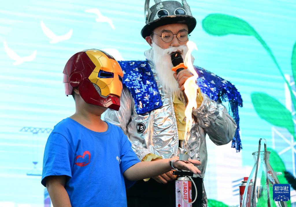 8月12日,在山东青岛,2025年建设工地“小候鸟”驿站暑托班的一名孩子在科学实验课上参与互动。