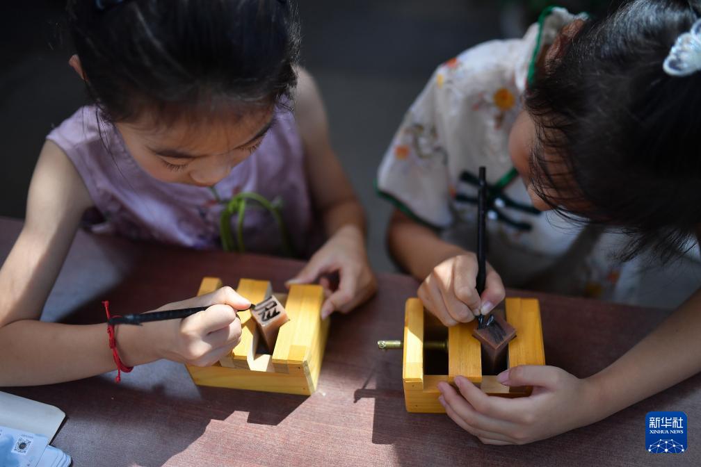 8月12日,在山东省青岛市城阳区棘洪滩街道一家非遗工坊,学生在体验篆刻。