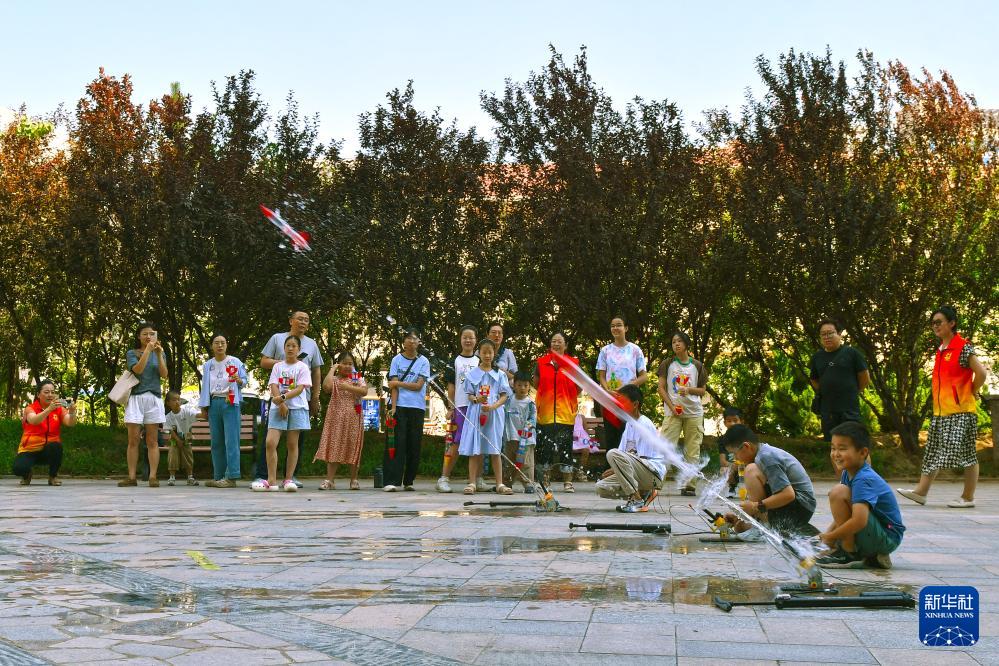 8月12日,小朋友在山东省烟台市福山区银河明珠社区暑期科普公益课堂上发射自制的“水火箭”。