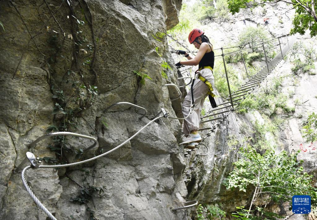 8月12日,在山东省枣庄市山亭区抱犊崮景区,一名小游客体验“飞拉达”攀岩项目。