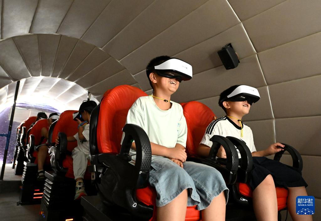 8月12日,在河北省石家庄市一家航天科技体验馆,小朋友在模拟太空舱内体验。