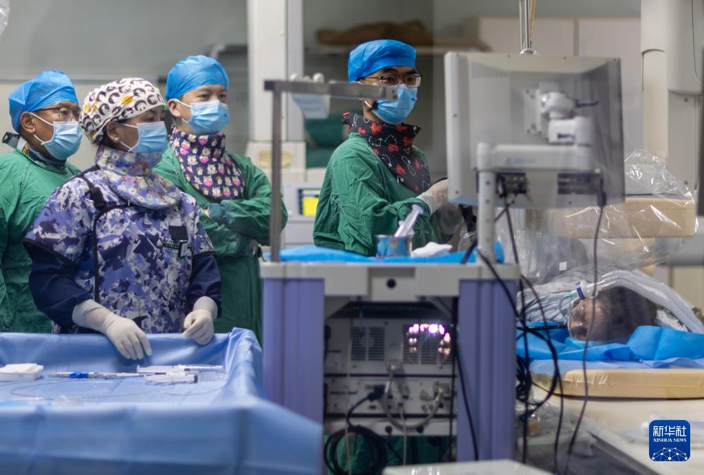 协和医院第十批援藏医生王强(左四)、第十一批援藏医生蒋青伟(左三)和西藏自治区人民医院医生扎西(左一)在拉萨为患者施行内镜逆行胰胆管造影术(8月5日摄)。