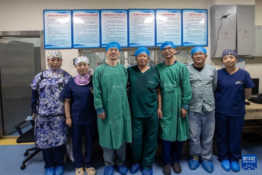 协和医院第十批援藏医生王强(右三)、第十一批援藏医生蒋青伟(左三)和西藏自治区人民医院医生扎西(中)、旦增索朗(右二)及手术团队,在拉萨为患者施行内镜逆行胰胆管造影术后合影(8月5日摄)。