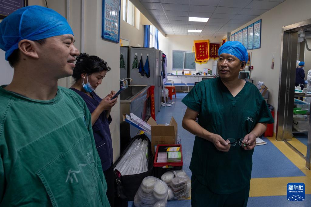 协和医院第十批援藏医生王强(左二)、第十一批援藏医生蒋青伟(右二)和西藏自治区人民医院医生旦增索朗(左一)在手术室外监控指挥手术(8月5日摄)。