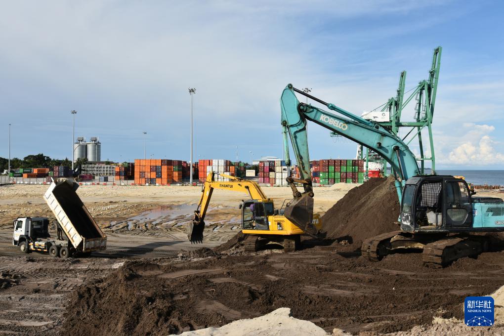 这是8月8日拍摄的文莱摩拉港集装箱码头扩建施工现场。