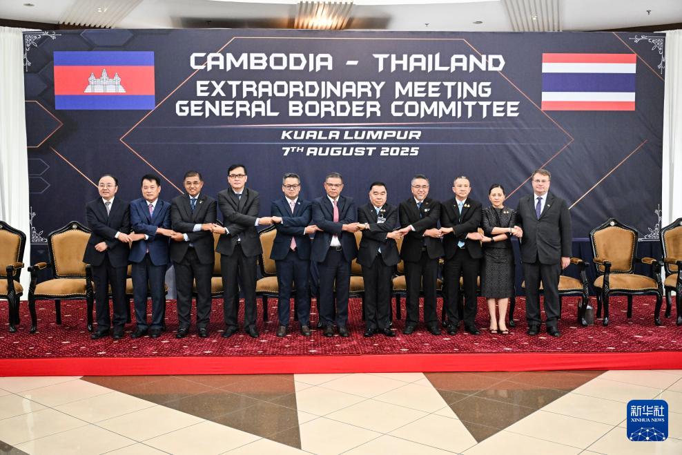 8月7日,在马来西亚吉隆坡,各方代表在柬埔寨与泰国边界总委会特别会议前握手合影。