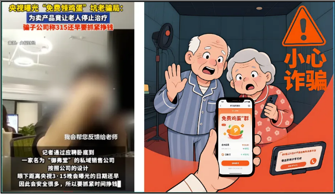 受害案例 “免费鸡蛋”钓大鱼!直播间专坑爸妈! 武大爷老两口,被“免费鸡蛋”吸引进群,入群后即被导入封闭的私域直播间里花费高价购买劣质品,后诱导脱离平台私下转账。武大爷和老伴还沉浸在“捡便宜”的喜悦中时,他们接到自称“平台客服”的电话,对方精准报出他们的姓名及平台账号,谎称他们“开通了直播带货功能”,每月将自动扣费800元。为“协助关闭”这项不存在的服务,骗子诱导老两口下载不明APP并开启屏幕共享功能,被转走10万元。