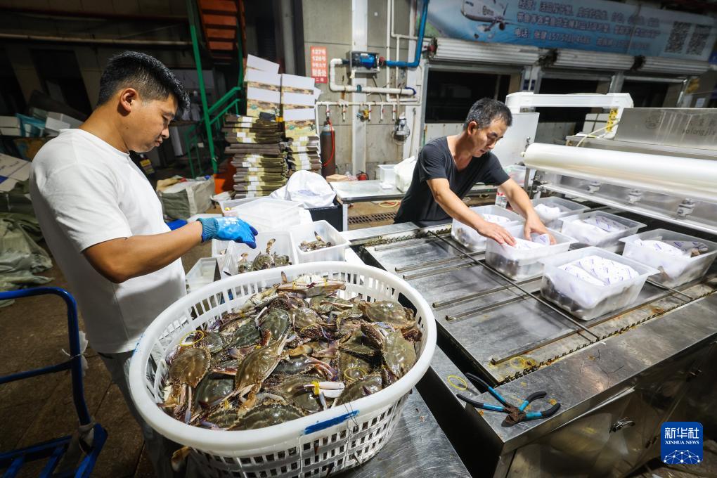 8月12日,商家在舟山沈家门舟山国际水产城内分拣、绑扎当天到港的梭子蟹。
