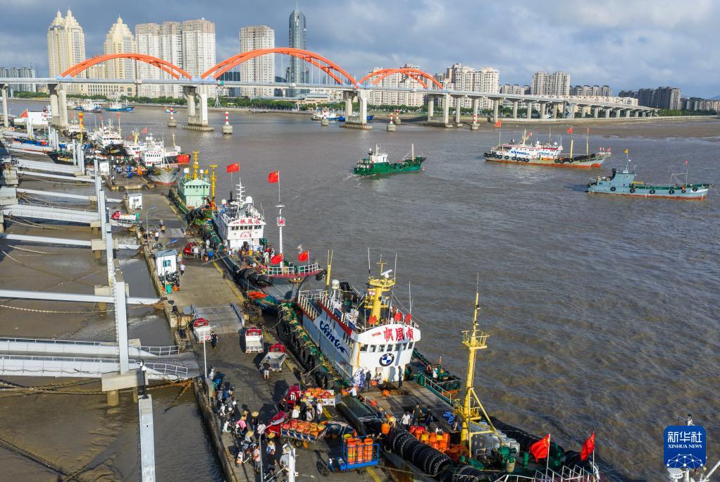 8月12日,开渔归来的渔运船靠泊在舟山沈家门舟山国际水产城码头,渔民把整筐的梭子蟹运送上岸装车。