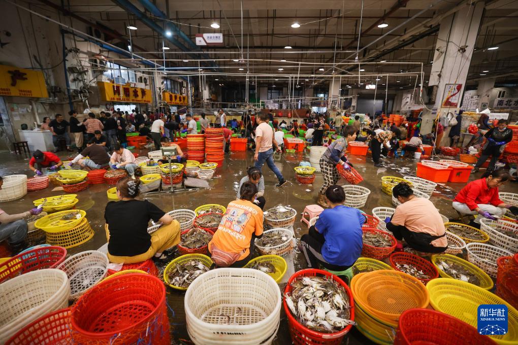 舟山沈家门渔港舟山国际水产城的商户们迎来了忙碌的时节,近期每天约有2000吨梭子蟹到港,经过分拣、绑扎后发往各地市场。
