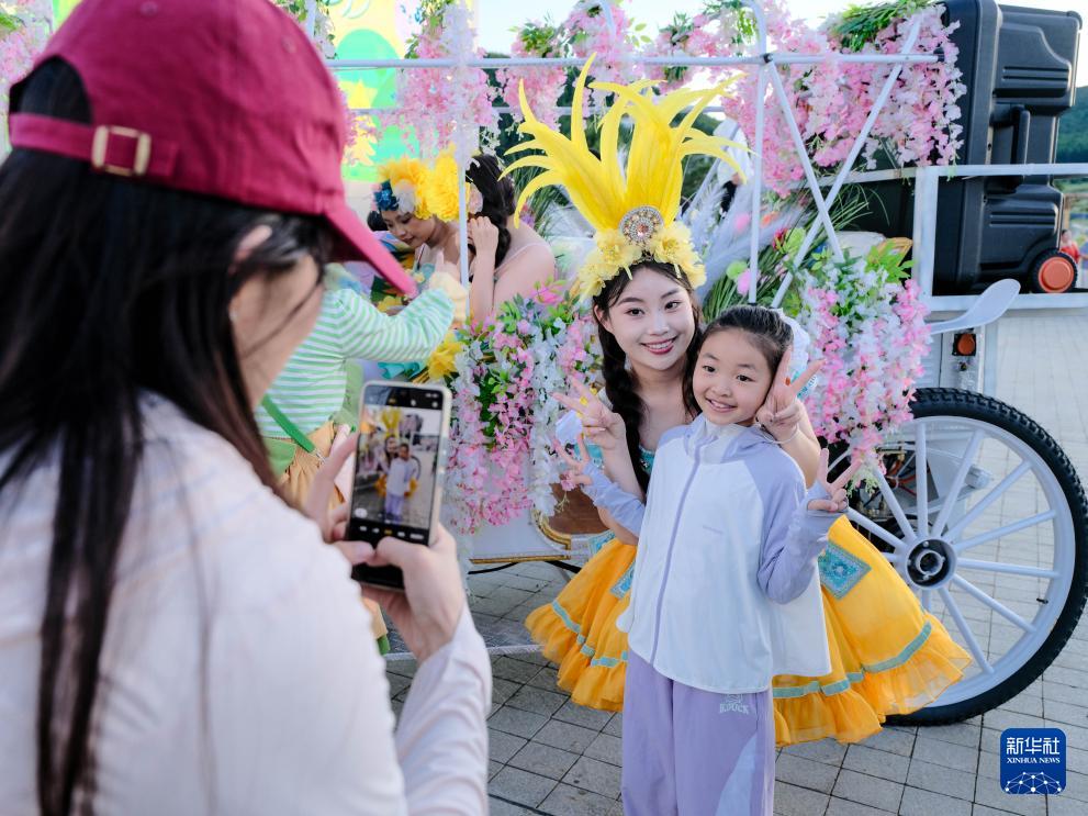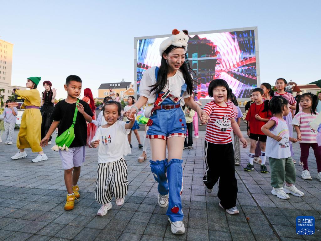 7月27日,在阿尔山市圣泉广场,花车巡游演员与小朋友互动。