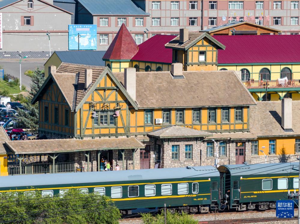 7月27日,一列火车驶出阿尔山火车站(无人机照片)。