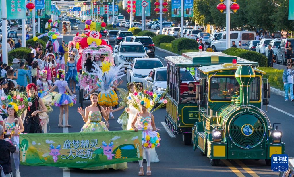 这是7月27日在阿尔山市街头拍摄的花车巡游车队和观光小火车(无人机照片)。
