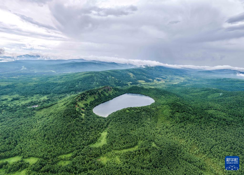 这是7月28日在内蒙古阿尔山国家森林公园拍摄的驼峰岭天池(无人机拼接照片)。