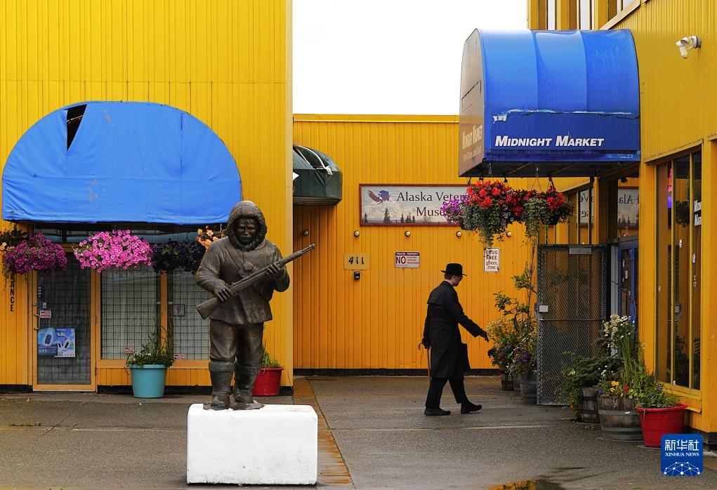 8月14日,在美国阿拉斯加州安克雷奇市中心,一名男子从一尊雕塑旁走过。