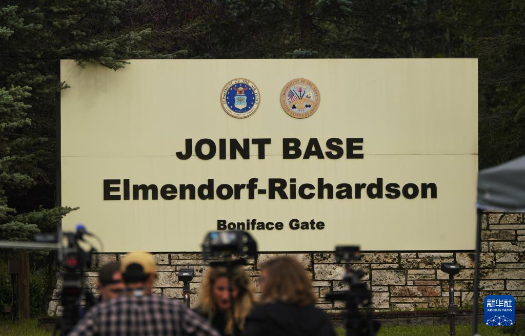 8月14日,媒体记者在美国阿拉斯加州安克雷奇的埃尔门多夫-理查森联合军事基地外报道。新华社记者吴晓凌摄