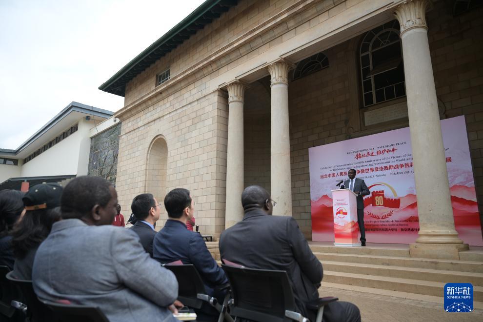 8月15日,在肯尼亚内罗毕国家博物馆,肯尼亚基西郡郡长阿拉蒂在纪念中国人民抗日战争暨世界反法西斯战争胜利80周年图片展上致辞。