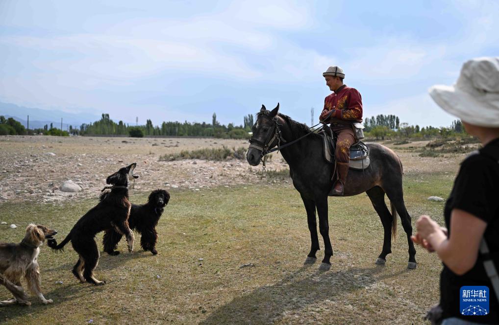 8月16日,在吉尔吉斯斯坦乔尔蓬阿塔附近,猎人努尔苏丹奖励猎犬。