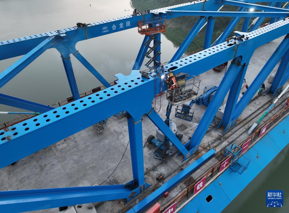 8月18日,工人在进行钢桁梁合龙焊接施工(无人机照片)。