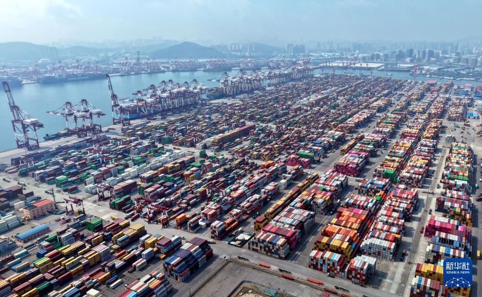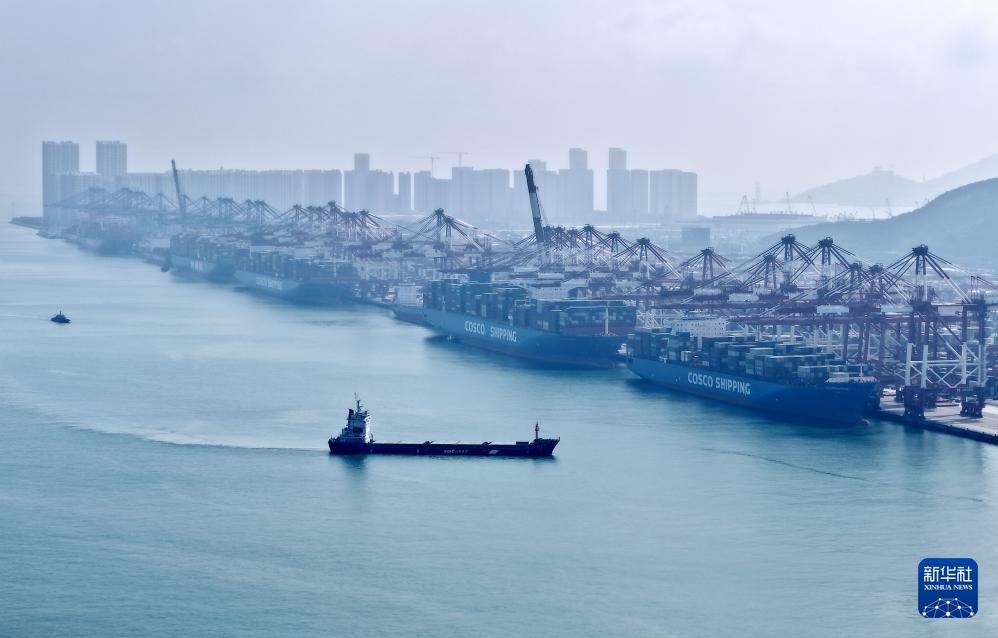 8月19日,货轮在山东港口青岛港前湾港区装卸集装箱(无人机照片)。