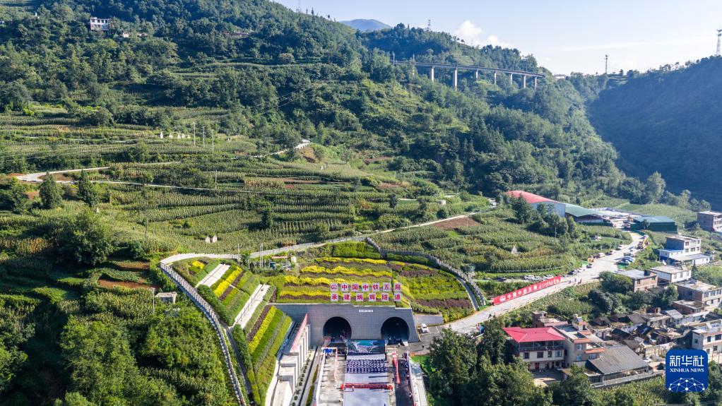 空中俯瞰渝昆高铁炳辉隧道洞口(8月19日摄,无人机照片)。
