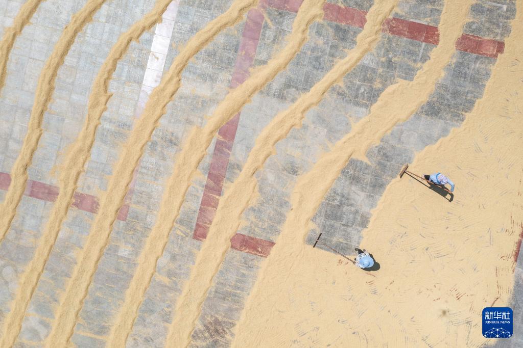 8月20日,人们在重庆市永川区红炉镇政府广场上晾晒粮食。