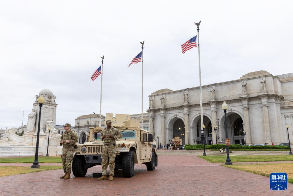 这是8月19日在美国首都华盛顿的联合车站外拍摄的国民警卫队成员和车辆。