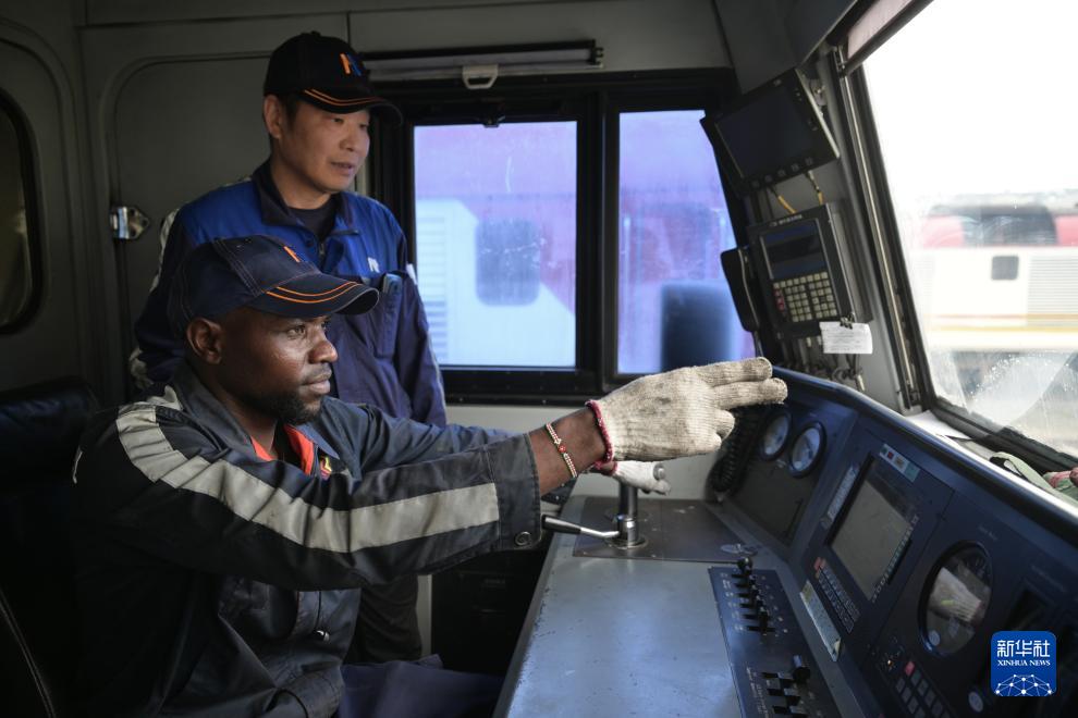 8月19日,在肯尼亚内罗毕非洲之星铁路运营有限责任公司机务运转整备场,中方工程师指导肯尼亚机车检查员(前)做机车动态检查。