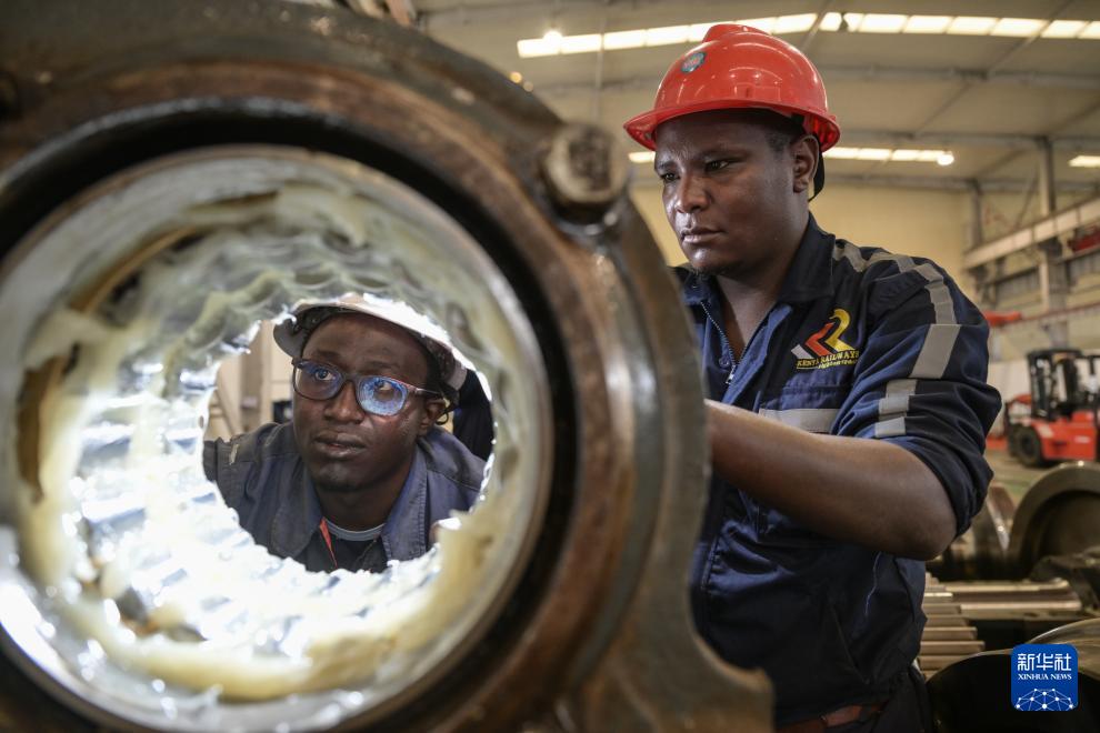 8月19日,在肯尼亚内罗毕非洲之星铁路运营有限责任公司机务检修车间,肯方工作人员检查即将组装的机车轮对轴箱。