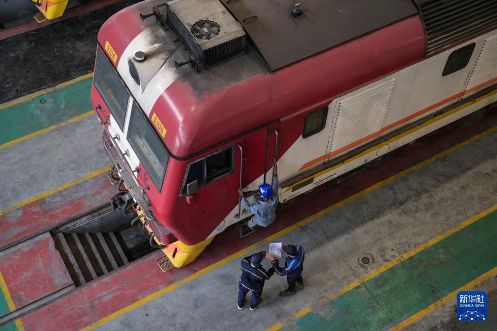 8月19日,在肯尼亚内罗毕非洲之星铁路运营有限责任公司机务检修车间,中肯铁路工作者在检查机车。