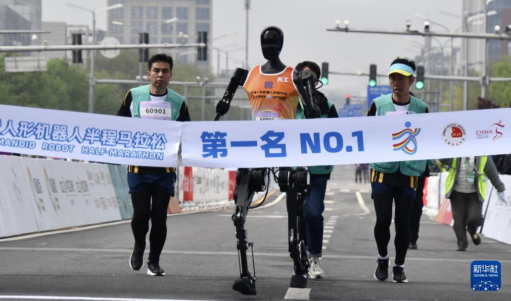 天工机器人在北京亦庄举行的人形机器人半程马拉松赛上夺得第一名(4月19日摄)。新华社记者 李欣 摄
