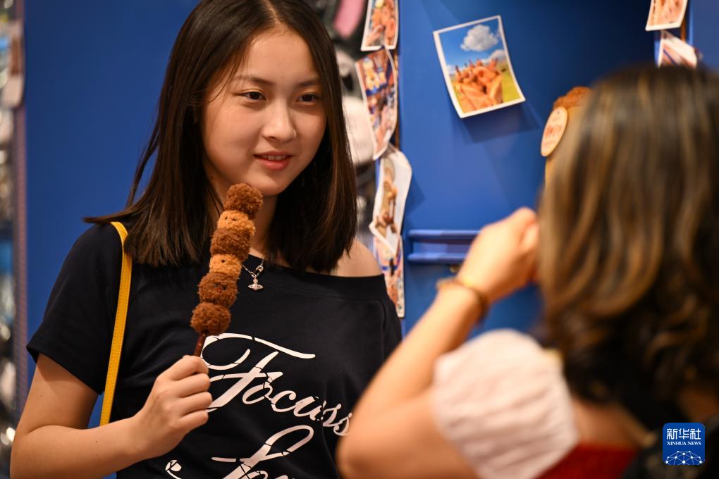8月21日,在乌鲁木齐大巴扎步行街,游客手持文创产品拍照留影。