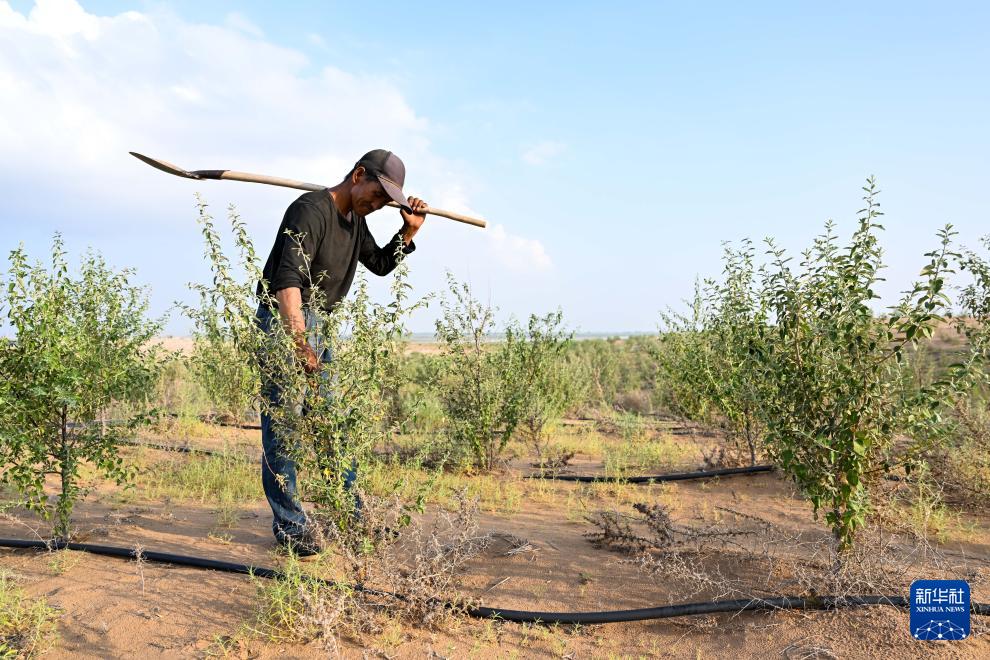 工人在黄河上中游阿拉善盟乌兰布和段(阎王鼻子)阻沙入河生态修复工程项目区查看林木生长情况(8月1日摄)。