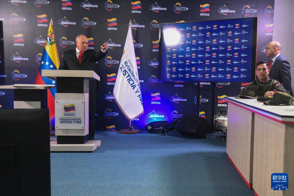 8月25日,委内瑞拉内政、司法与和平部部长卡韦略(左)在首都加拉加斯举行的新闻发布会上发表讲话。新华社发(萨尔戈多摄)