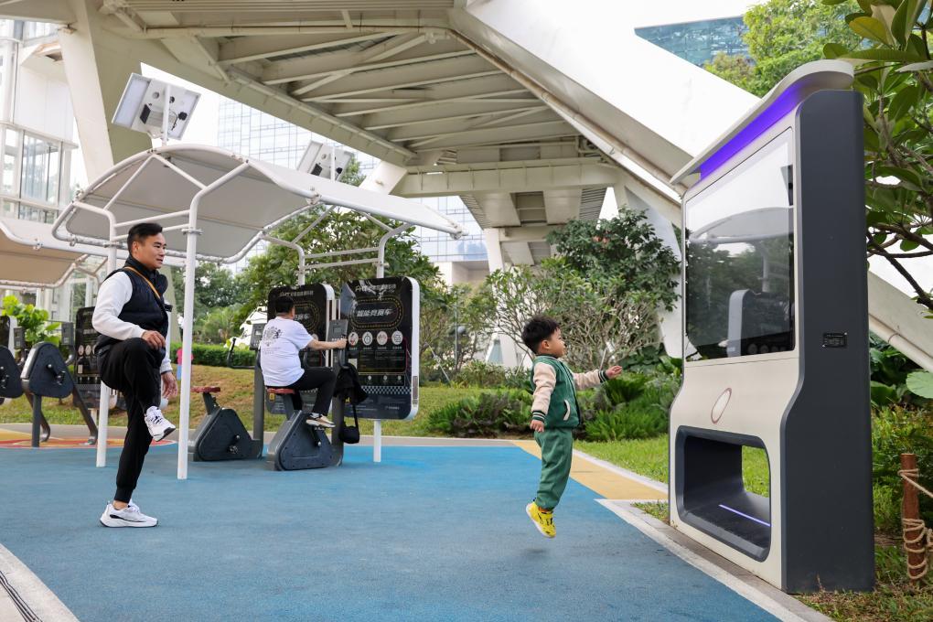 2024年12月27日,在深圳笔架山公园里,小朋友和家长一起使用智能互动屏锻炼身体。新华社记者 梁旭 摄