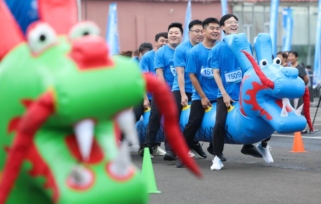 2025年8月8日,在河北省石家庄市正定县塔元庄村举办的“全民健身日”乡村运动会上,参赛群众进行“旱地龙舟”比赛。新华社发(梁子栋摄)