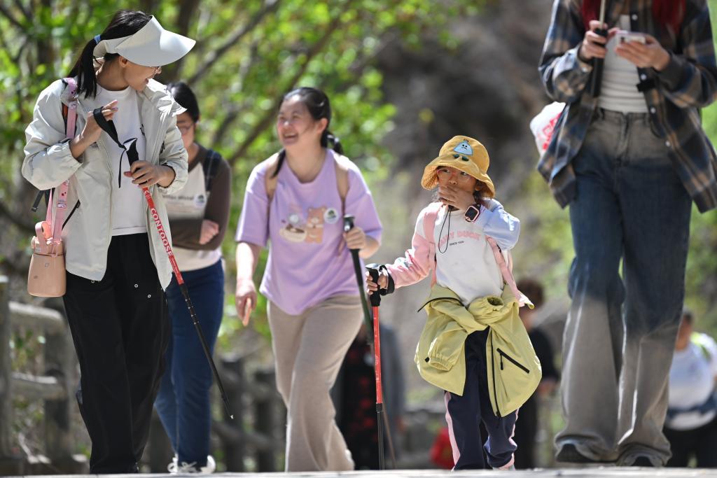 2025年4月19日,人们在徒步登山中。当日,800余名健身爱好者参加天津市蓟州区八仙山首届登顶大会,在徒步登山中享受春光。新华社记者 李然 摄