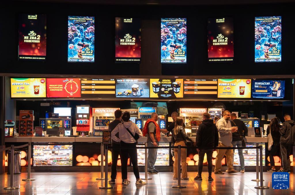 8月26日,在波兰首都华沙的影院售票区,显示屏展示中国动画电影《哪吒2》宣传海报。