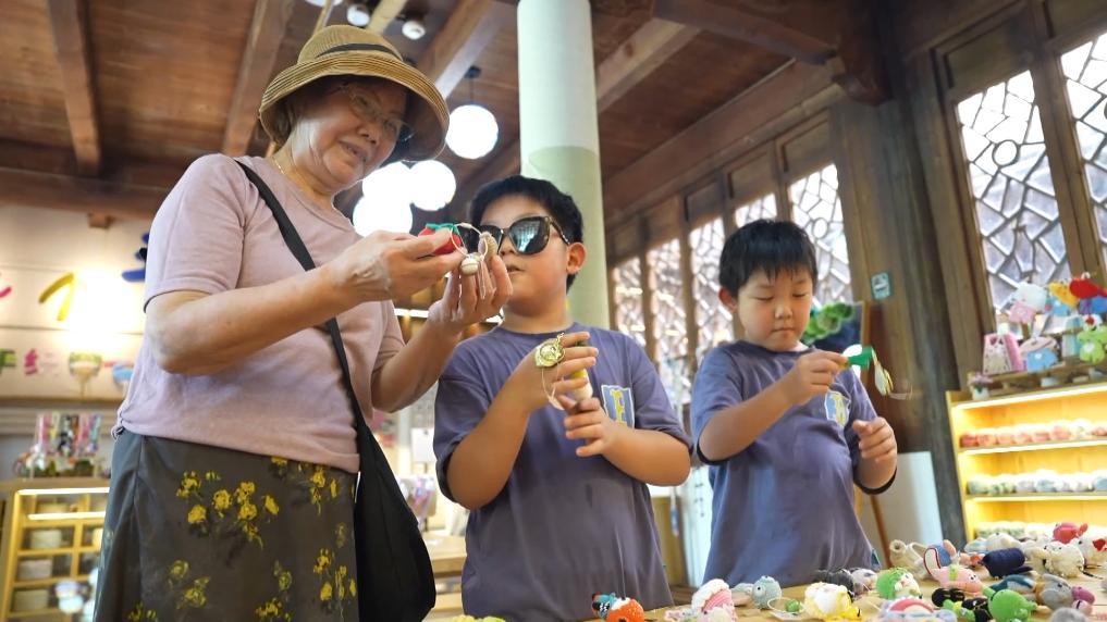浙江嘉兴桐乡市的濮院时尚古镇是全国最大的羊毛衫集散中心。在濮院的一家毛线工坊内,来自上海的游客正在欣赏店内精美的毛线工艺品。