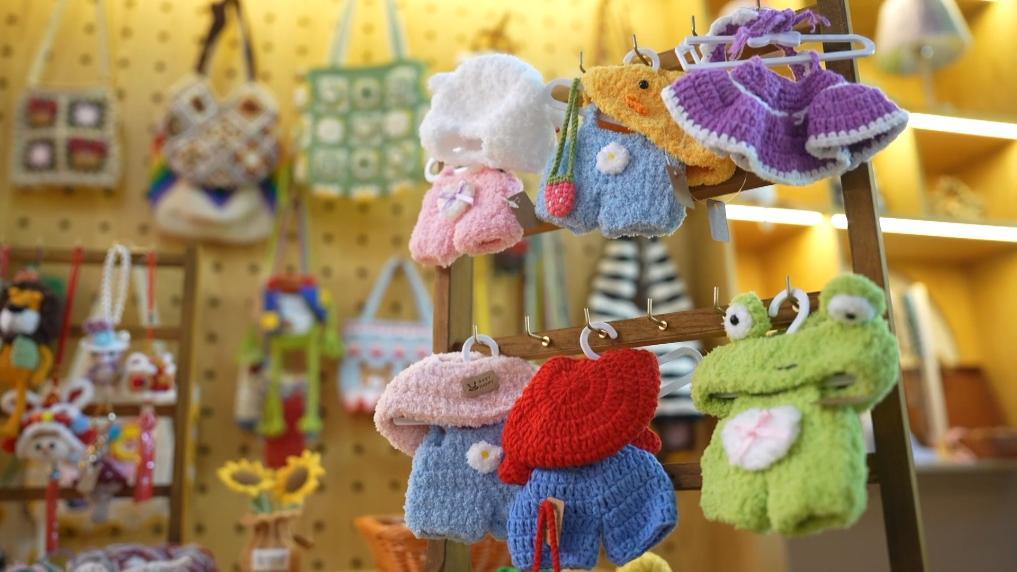 这些“娃衣”出自桐乡市一家已经开了20多年的老牌服装厂,走进厂区二楼的“多巴胺毛线屋”,各种毛线玩偶、包包琳琅满目,“娃衣”更是款式各异,背带裤、上衣、裙子应有尽有。