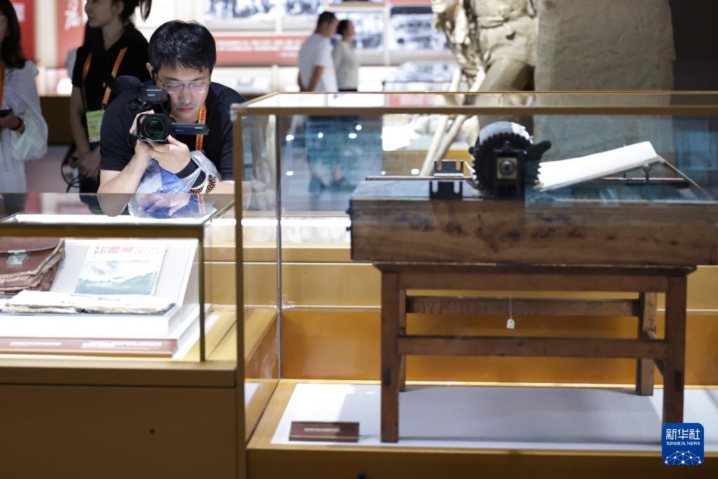 8月27日,一名记者在中国人民抗日战争纪念馆内采访。