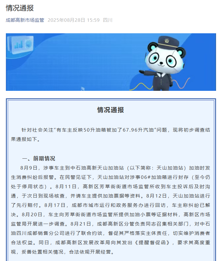 8月9日,涉事车主到中石油高新天山加油站(以下简称:天山加油站)加油时发生消费纠纷后报警。在民警见证下,天山加油站对涉事06#加油箱进行封存(至今仍处于停用状态)。8月11日,高新区芳草街街道市场监管所收到车主投诉后及时沟通,于次日到现场核查,并请车主提供加油票据等资料。8月12日,天山加油站进行了先行赔付。8月17日,成都市城市运行和政务服务办进行回访,车主称纠纷已解决。8月20日,车主向芳草街街道市场监管所提供加油小票等证据材料,高新区市场监管局开展进一步调查。8月21日,成都高新区分管负责同志召集相关部门,对中石油四川成都销售分公司进行了联合约谈,督促其严格落实主体责任,切实维护消费者合法权益。同日,成都高新区发展改革局向其发出《提醒督促函》,要求其高度重视,妥善处置相关情况,合法依规开展经营。