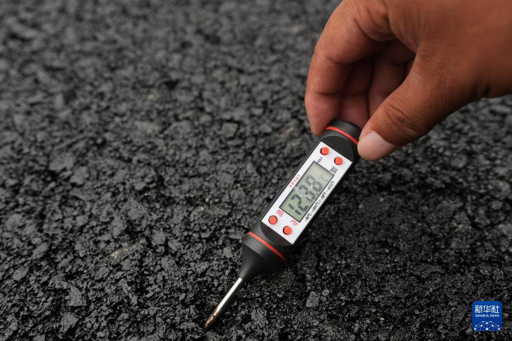 8月28日,技术人员在监测摊铺沥青温度。