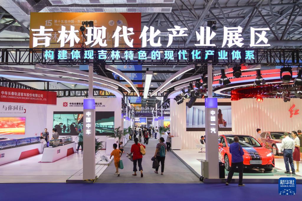 参观者在第十五届中国—东北亚博览会吉林现代化产业展区参观(8月28日摄)。新华社记者 许畅 摄