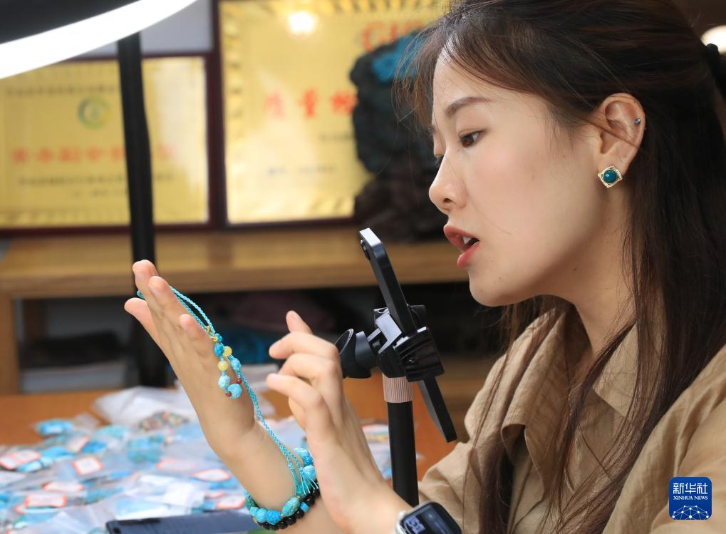 8月30日,一位主播在湖北省竹山县为绿松石产品做直播。