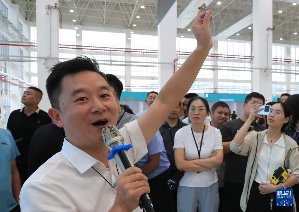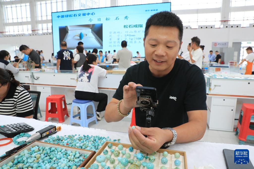 8月30日,工作人员在湖北省竹山县中国绿松石交易中心举行的“今日松石秀”活动上主持拍卖绿松石产品。