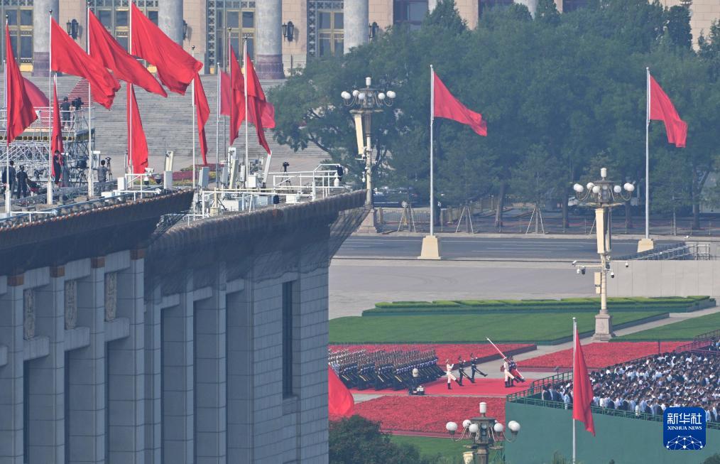 9月3日,纪念中国人民抗日战争暨世界反法西斯战争胜利80周年大会在北京隆重举行。这是国旗护卫队官兵护卫着五星红旗行进。