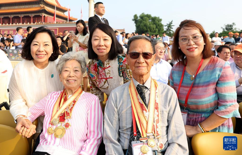 9月3日,纪念中国人民抗日战争暨世界反法西斯战争胜利80周年大会将在北京隆重举行。这是来自香港的抗战老兵林珍(前左)、谢祥兴(前右)在观礼台上。
