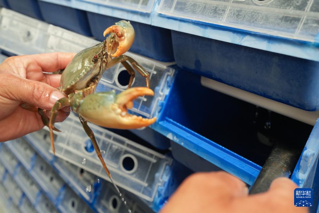 9月2日,在宁海县一市镇的一家青蟹生产企业,工作人员在暂储青蟹的“蟹公寓”中查看其健康状态。