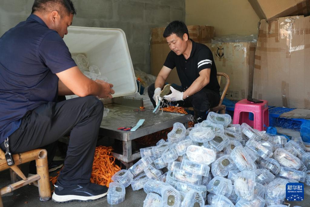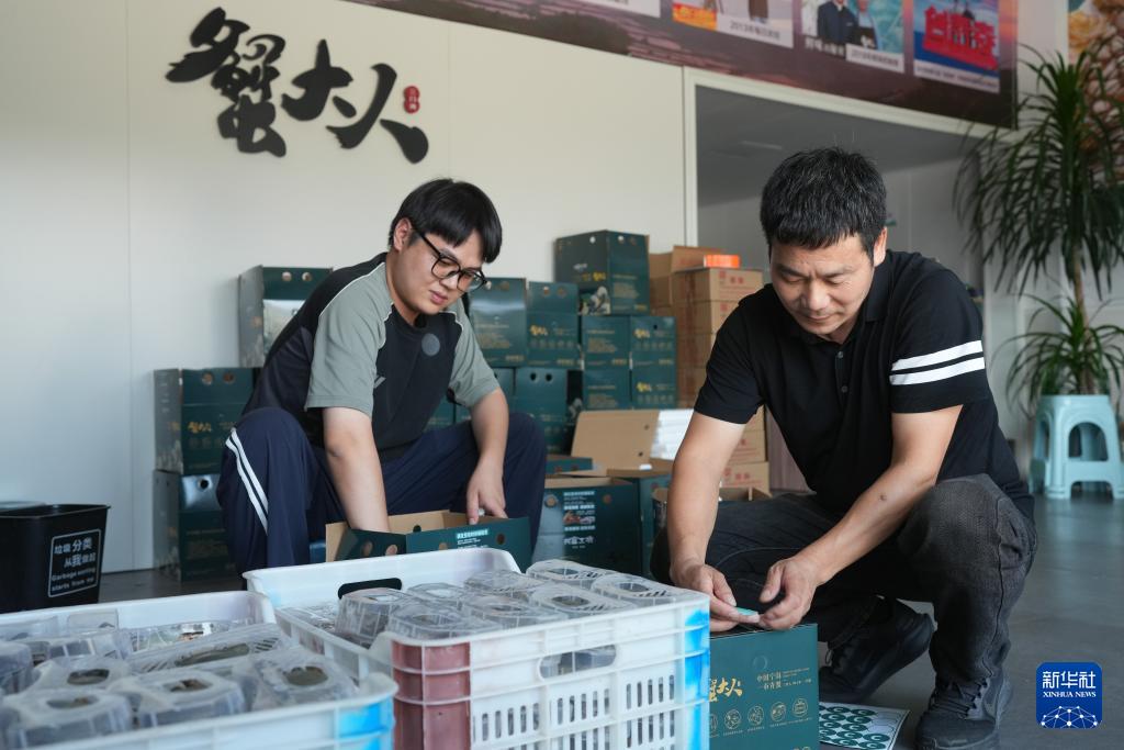 9月2日,在宁海的一家青蟹销售网店,工作人员将青蟹装箱快递。